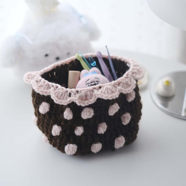 ドットの小物入れ ˖ ࣪⊹ ピンクとブラウンのドットが印象的な可愛らしい小物入れです♩ 日常の小物をおしゃれに収納でき、あなたのお部屋に華やかさをプラスします⟡.· フリルのデザインがキュートで、お部屋のアクセントとしても♡底にはプラスチックの板が入っているので、形崩れもありません⟡.· サイズ感も絶妙で、デスクやリビングの隅に置いてもスッキリと馴染みます。 小物の整理整頓に最適なアイテムです! ⋆⸜ ♫ ⸝⋆ 手作りの商品ですので、大きさや形に若干の個体差が生じる場合がございます。画面上では色が異なって見える場合がございますのでご了承ください。 気になる点などがございましたら、お気軽にご連絡ください。(՞ . .՞)